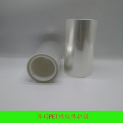 PET網(wǎng)紋保護膜是將聚酯薄膜作為基材,在原料單面通過涂布機涂布丙烯酸脂類粘劑再收卷而形成。在PET保護膜表面有整齊排列的網(wǎng)紋分布,保護膜的厚度由30um~130um不等。粘度分為超低粘、低粘、中粘、中高粘和高粘,根據(jù)貼合材料不同來選擇PET網(wǎng)紋保護膜的厚度和粘度。