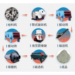 鋼渣通過給料機(jī)均勻送至顎式破碎機(jī)進(jìn)行粗碎處理,粗碎加工后的鋼渣通過篩分設(shè)備將其篩分成不同粒度的物料,不符合粒度要求的要再次進(jìn)行粗碎;符合粒度要求的(10cm左右)由輸送機(jī)送至液壓圓錐破進(jìn)行中細(xì)碎處理,同樣要經(jīng)過篩分設(shè)備進(jìn)行篩分,2cm左右的可直接進(jìn)入下一環(huán)節(jié),大于2cm的要重返圓錐破破碎,下一環(huán)節(jié)主要根據(jù)實(shí)際需求而定,如果需要的成品是石子就可以直接將其作為成品進(jìn)行除鐵工藝;如果需要的是細(xì)粉則需要進(jìn)入棒磨機(jī)進(jìn)行磨粉處理,粒度達(dá)到需求后,再由磁選機(jī)加工為鋼渣鐵精粉等成品。https://www.kjzj.com/product/7-37-0-0/